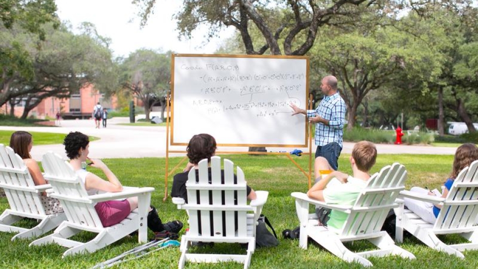 While San Antonio can be unbearably hot during the summer months, temperate weather through the rest of the year gives Trinity faculty the chance to take their classes outdoors. Students basking in the sunlight, often in Trinity’s iconic Adirondack chairs, are soothed by the sounds of the burbling Miller Fountain, while the ringing Murchison Tower provides a calming soundtrack to their studies.
